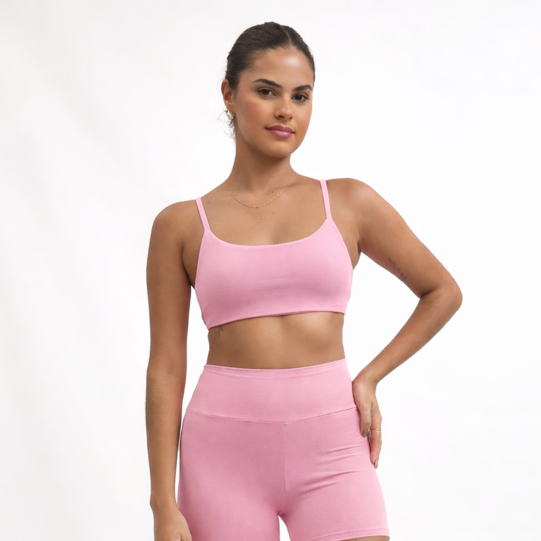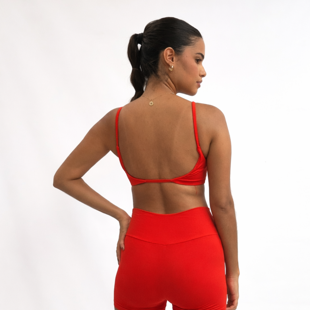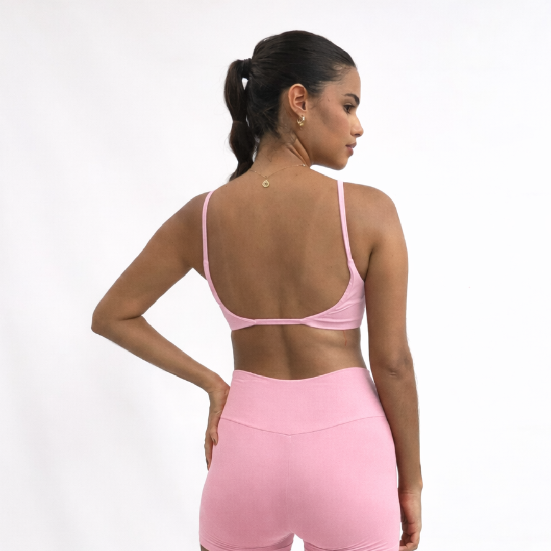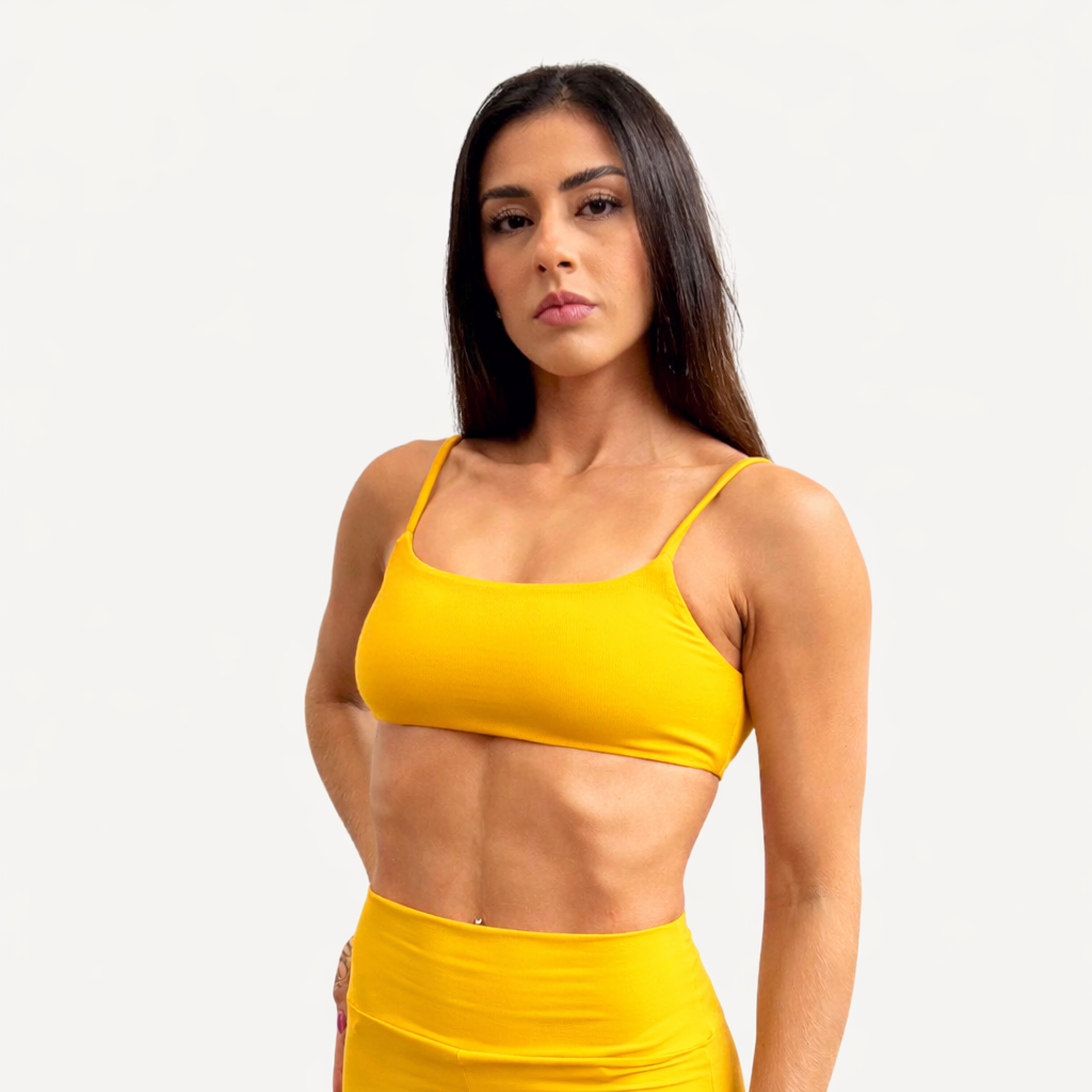 O top fita é um dos favoritos e conta com decote aberto nas costas. Ideal para práticas de baixo impacto, como yoga, pilates, musculação e, também, para compor looks casuais.