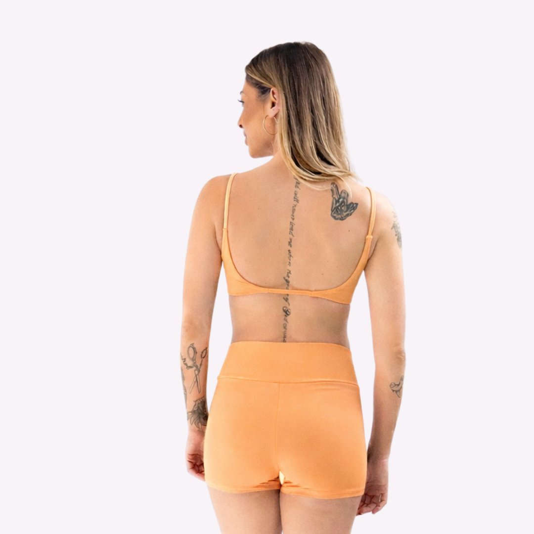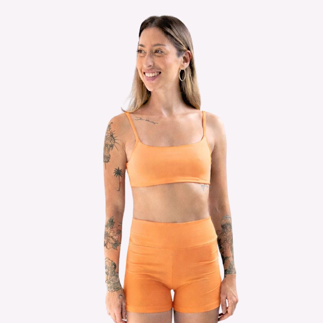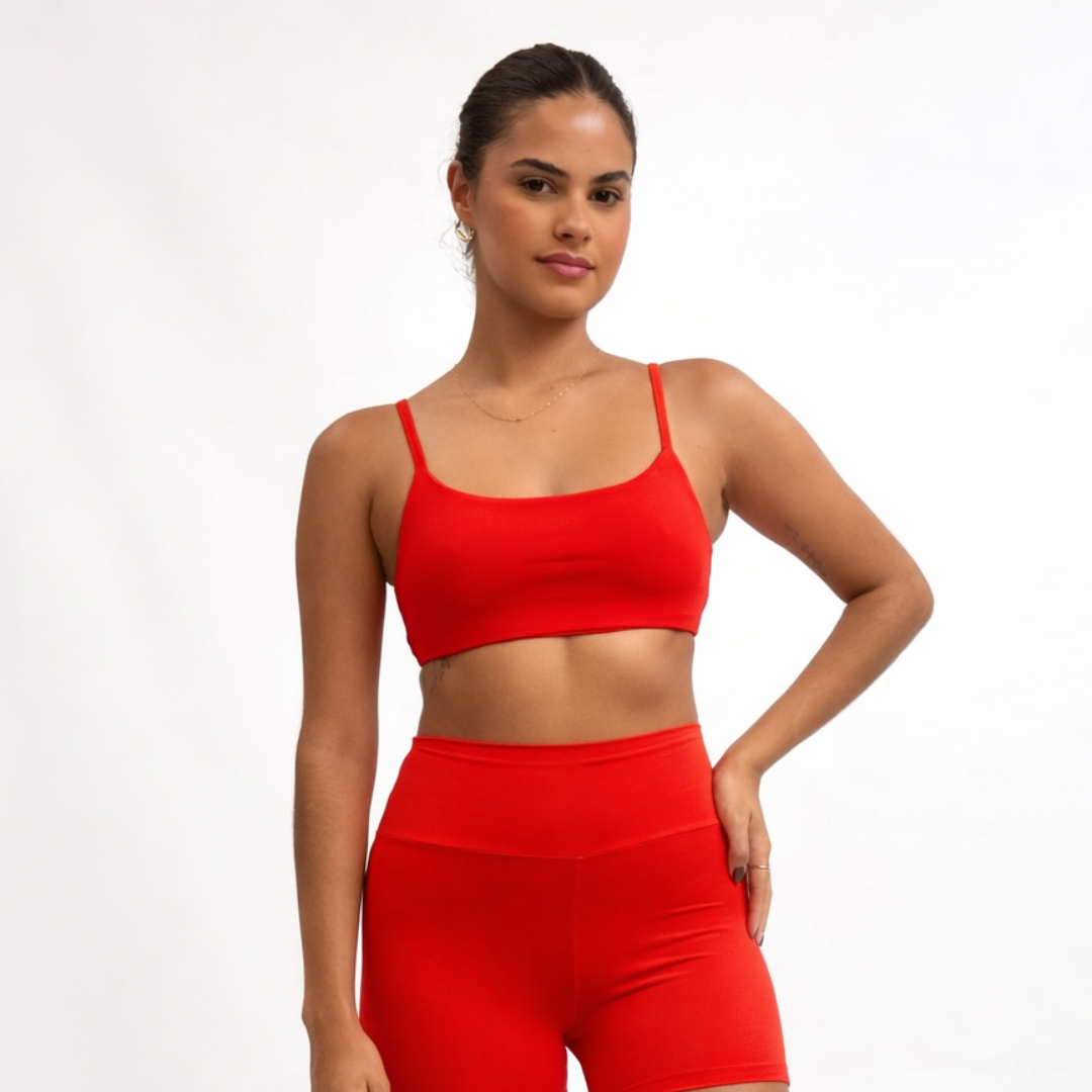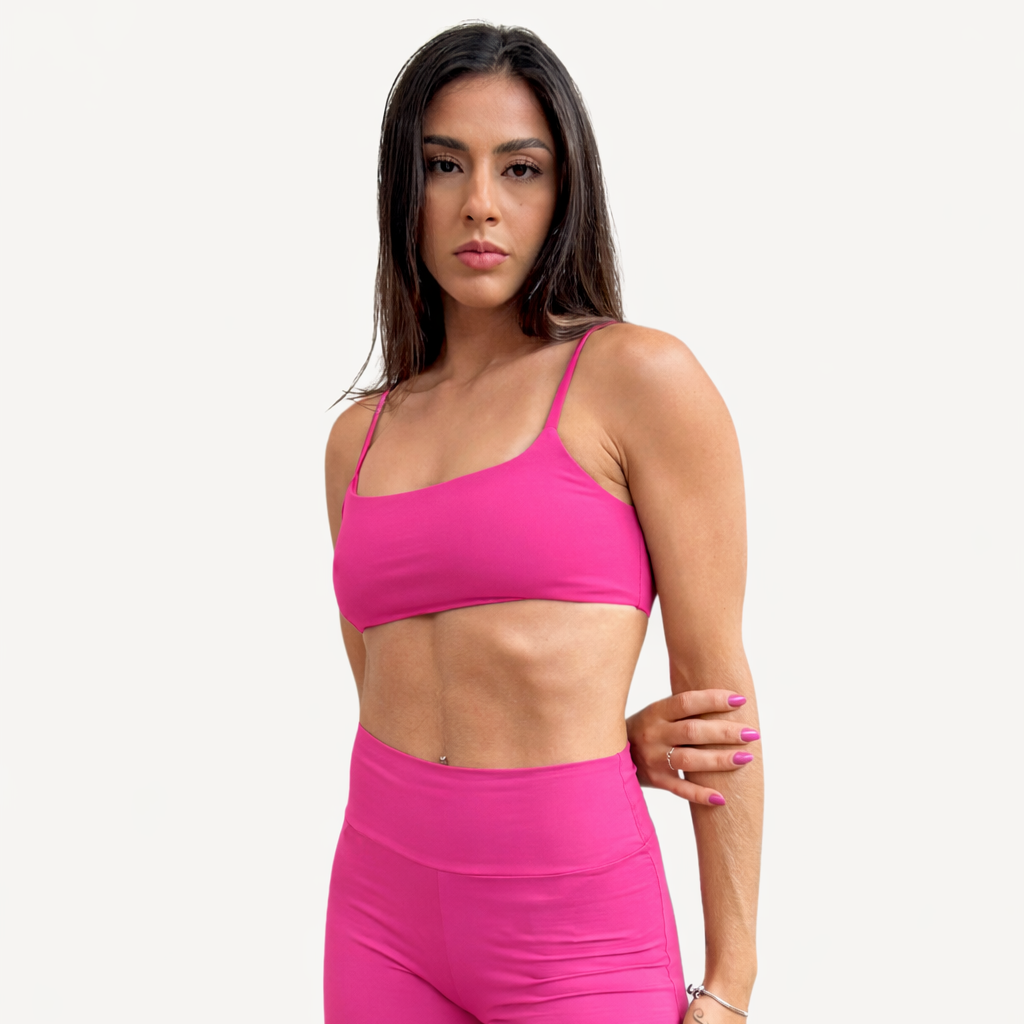 O top fita é um dos favoritos e conta com decote aberto nas costas. Ideal para práticas de baixo impacto, como yoga, pilates, musculação e, também, para compor looks casuais.